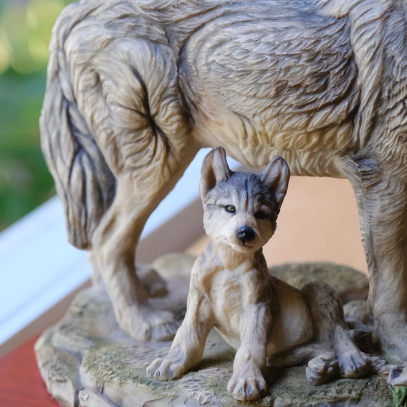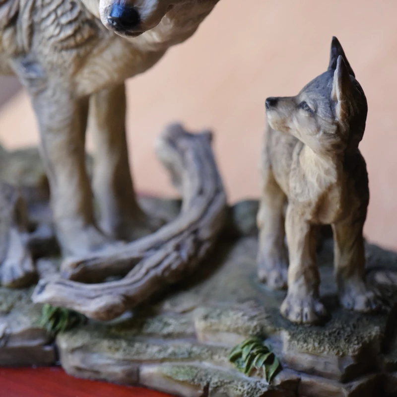 รูปหล่อเรซิน ครอบครัวหมาป่า mill creek Studio จากแบรนด์อเมริกา งานวัสดุเป็นเรซินผสมผมหินอ่อนเนื้อแน่นละเอียดต่ำ พร้อมลงสีด้วยขั้นตอนลงสีมือทุก ขั้นตอนตัวฐานเป็นไม้ รายละเอียดสินค้าคมชัดมาก