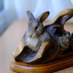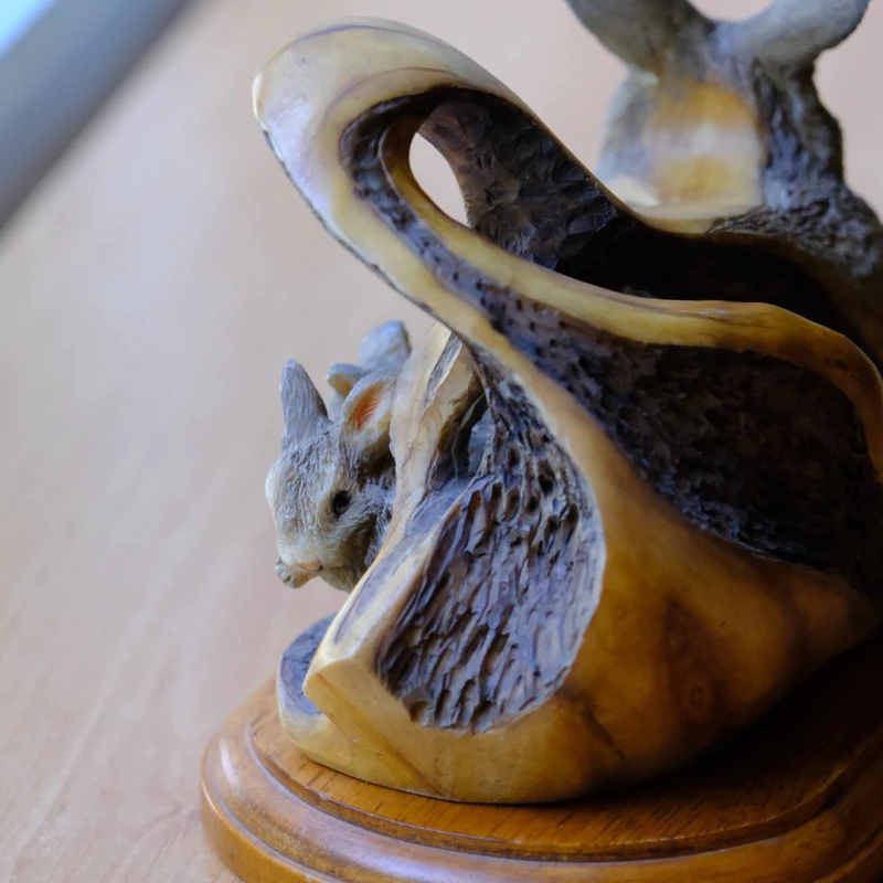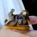 ผลงานปั้นรูปครอบครัวแม่ลูกอ่อนกำลังพักผ่อน โดยลูกๆ นอนซุกตัวแนบชิดกับแม่อย่างอบอุ่นปลอดภัย ตั้งอยู่บนแท่นไม้โอ๊คสุดคลาสสิก งานอาร์ตชิ้นนี้สร้างสรรค์ขึ้นในปี 2000 มีลายเซ็น ’00 HAJNY‘ ประทับไว้บริเวณหลังของแม่จิ้งจอก