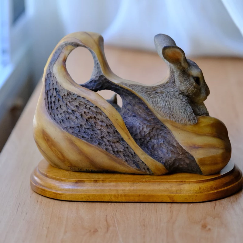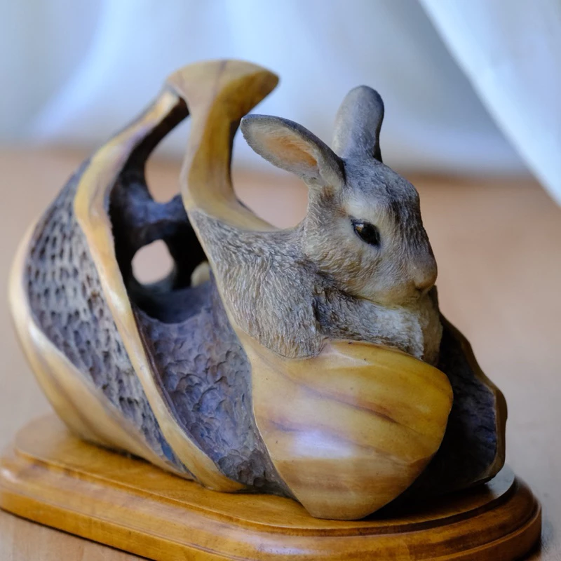 ความโดดเด่นอยู่ที่การแสดงออกถึงรายละเอียดอย่างประณีต ตั้งแต่น้ำตาลอ่อนๆ บริเวณใบหูด้านใน ไล่ไปจนถึงพื้นผิวสัมผัสที่ผสมผสานกันอย่างลงตัวระหว่างพื้นผิวไม้กับความสมจริงของตัวจิ้งจอก ขนาดกว้าง 8 นิ้ว ลึก 5 นิ้ว สูง 5.5 นิ้ว