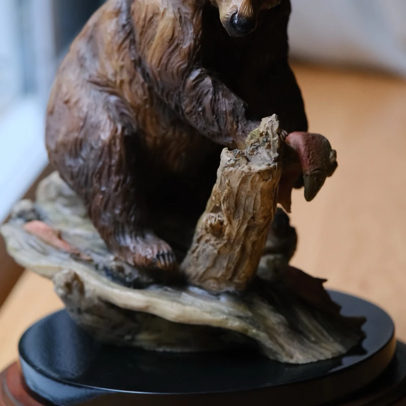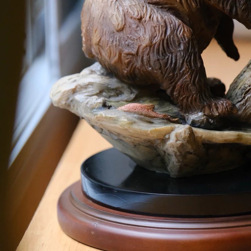 ประติมากรรมหมีสีน้ำตาลสุดตระการตา กำลังยืนอยู่ในสายน้ำเชี่ยวกราก พร้อมปลาที่เพิ่งจับได้ ในขณะที่ปลาตัวอื่นๆ กำลังว่ายผ่านไปในลำธาร ภาพแห่งธรรมชาติอันน่าทึ่งที่จับมาไว้ในงานศิลปะชิ้นนี้