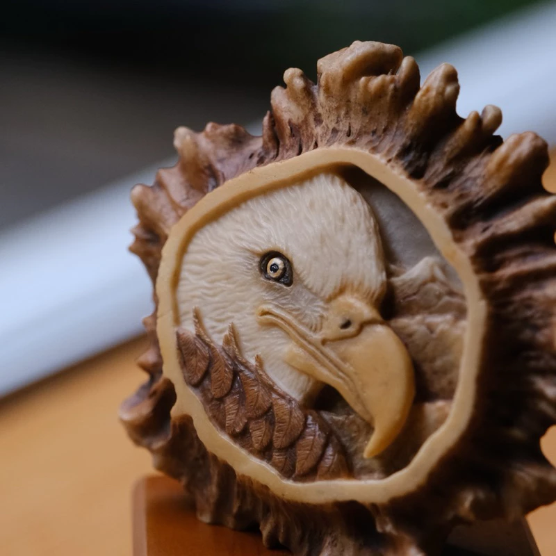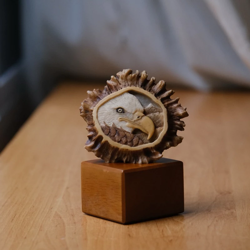 รูปปั้นนกอินทรีหัวขาวบนฐานไม้ – งานแกะสลักสุดประณีตโดย Lance Domonoske (1992)