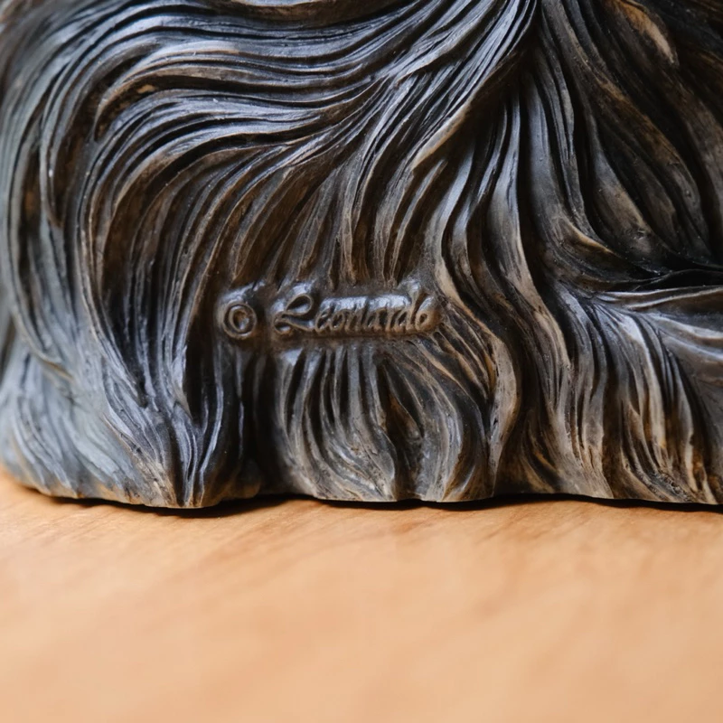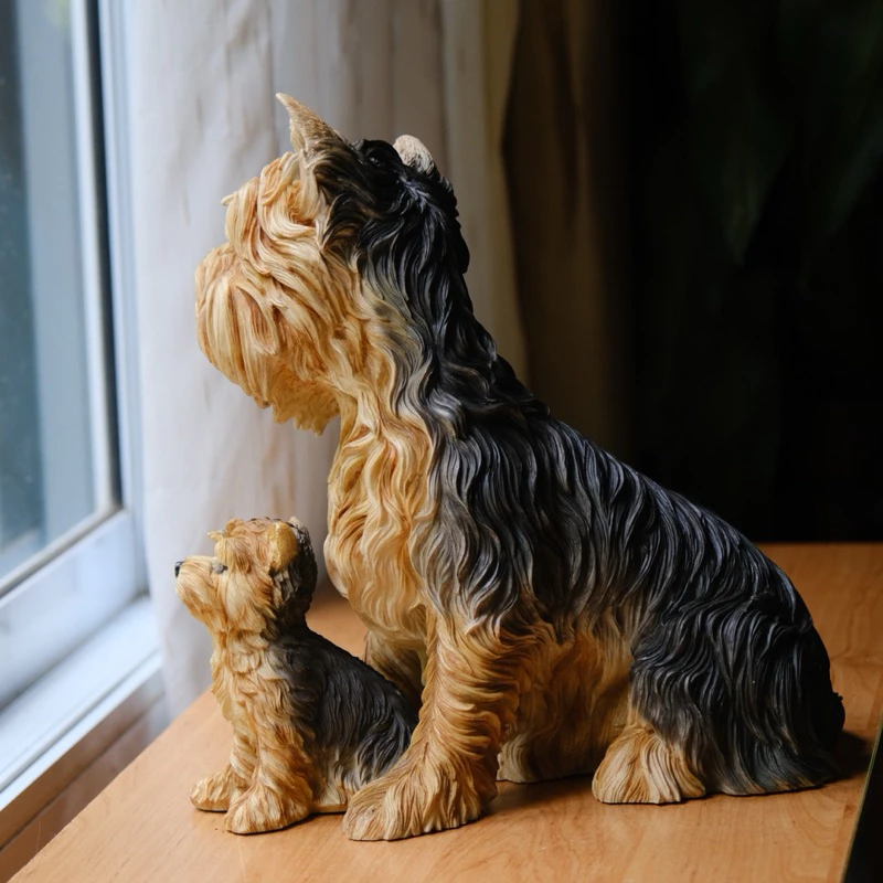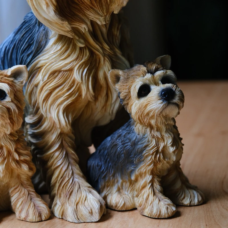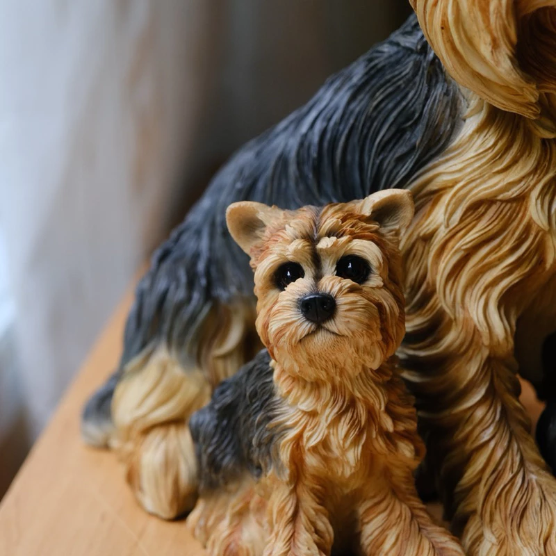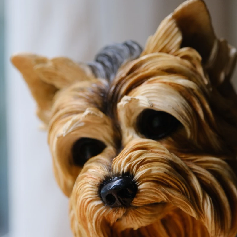 น้องหมาโยร์กี้ตัวนี้ทำจากเรซิน มีขนสีน้ำตาลทองดูนุ่มสวยงามสมจริง แต่ละเส้นขนปั้นและระบายสีอย่างประณีต ช่วยเน้นให้เห็นความน่ารักของสายพันธุ์นี้ได้เป็นอย่างดี น้องหมานั่งหันหน้ามองมาทางเรา ดวงตากลมโตสีดำสนิท จมูกชมพูน่าหยิก ท่าทางดูซื่อใสไร้เดียงสาน่าเอ็นดู