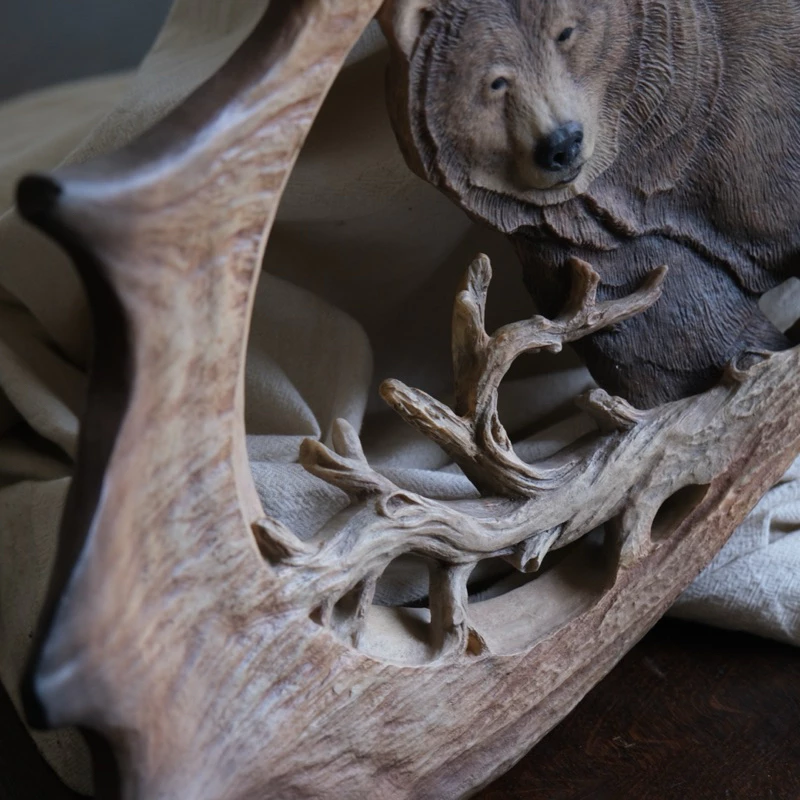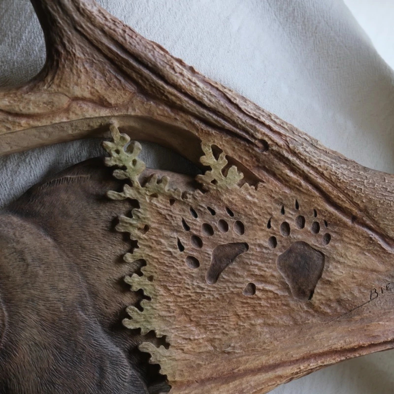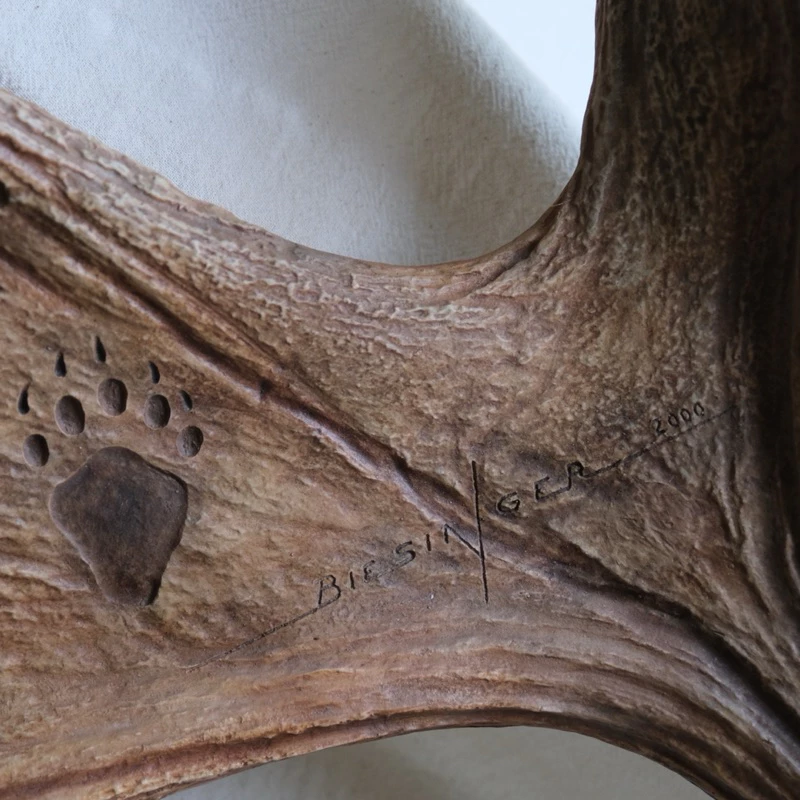 เขากวางมูสติดผนังพร้อมแกะสลักรูปหมีกริซลี่ ผลงานวินเทจสุดพิเศษออกแบบโดยศิลปินชื่อดัง Biesinger จากอเมริกา งานศิลปะชิ้นนี้โดดเด่นด้วยความคมชัดของลายเส้นและการลงสีแบบละเอียดประณีตที่สร้างมิติให้ภาพหมีดูมีชีวิตชีวา